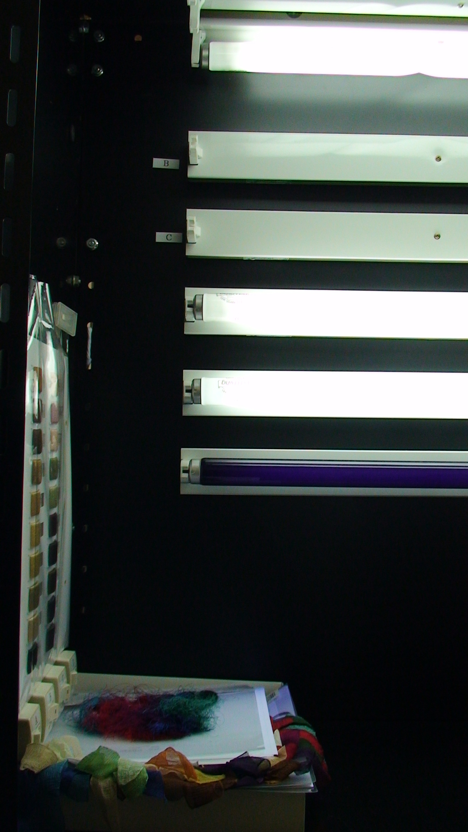 また、日が暮れるのが早い冬場では仕事が捗りませんので、光源が太陽光【自然光】指定の場合は、社内にある光源BOXのトルーライトを使用して色合わせを行います。