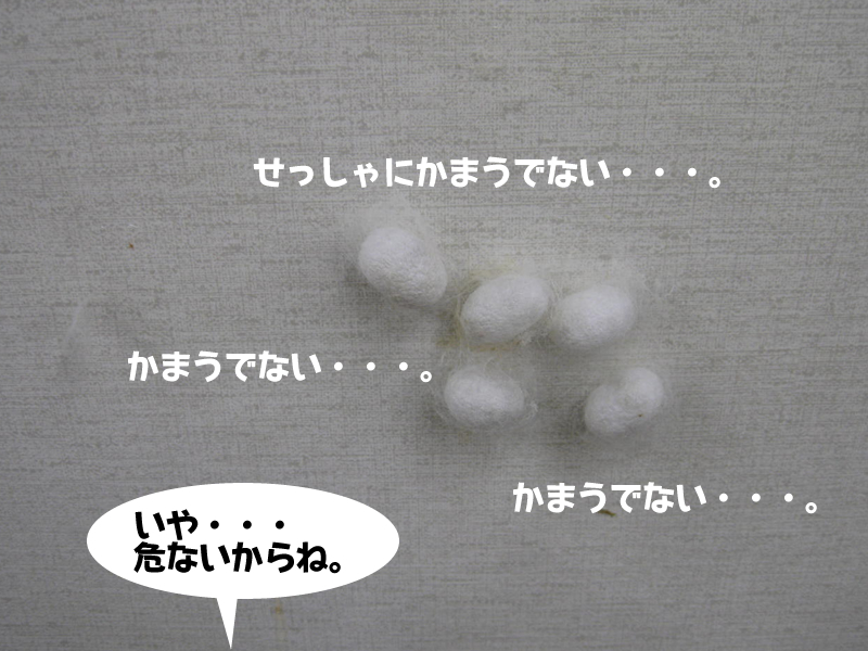 壁に5つの繭が!他のかいこはあんまり真似をしないでと心の中で思っています。